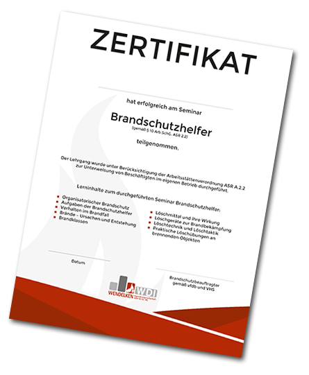 Nach erfolgreicher Teilnahme an einem unserer Brandschutz-Seminare erhalten Sie abschließend ein Zertifikat, das Sie künftig als geprüfte(n) Brandschutzhelfer(in) ausweist.